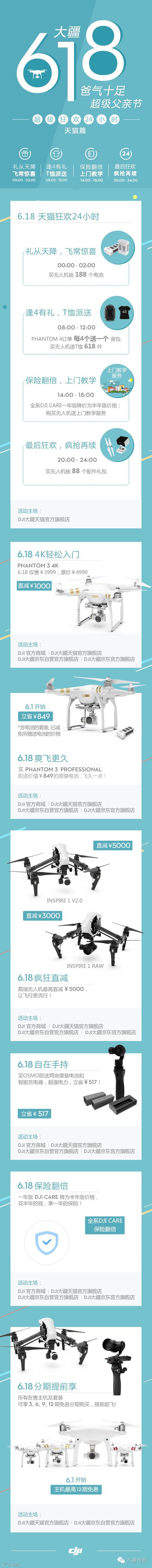 618活动当天,购买Phantom 3 4K即减1000元,购买灵眸Osmo送两块原装电池及一个智能充电器。此外,DJI大疆天猫官方旗舰店还有24小时狂欢活动。戳长图,查看618优惠攻略。
