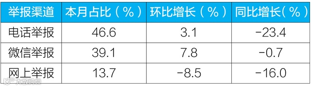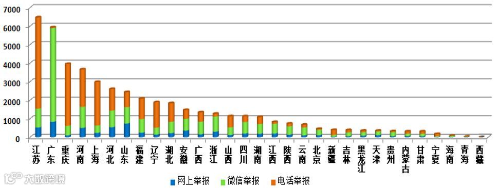 从各地区不同渠道举报数量看,江苏、重庆、河南、上海等地电话举报量较多,广东微信举报占比达85.4%。