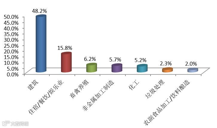 从行业类型来看,本月公众反映最集中的行业是建筑业,占48.2%,其次为住宿餐饮娱乐业和畜禽养殖业,分别占15.8 %和6.2%。