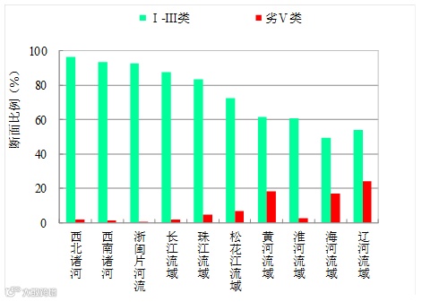 1-3月,长江、黄河、珠江、松花江、淮河、海河、辽河等七大流域及西北诸河、西南诸河和浙闽片河流Ⅰ-Ⅲ类水质断面比例为76.3%,同比上升6.6个百分点;劣Ⅴ类为6.7%,同比下降3.3个百分点。主要污染指标为氨氮、化学需氧量和五日生化需氧量。其中,西北、西南诸河和浙闽片河流水质为优,长江和珠江流域水质良好,松花江、黄河、淮河和海河流域为轻度污染,辽河流域为中度污染。