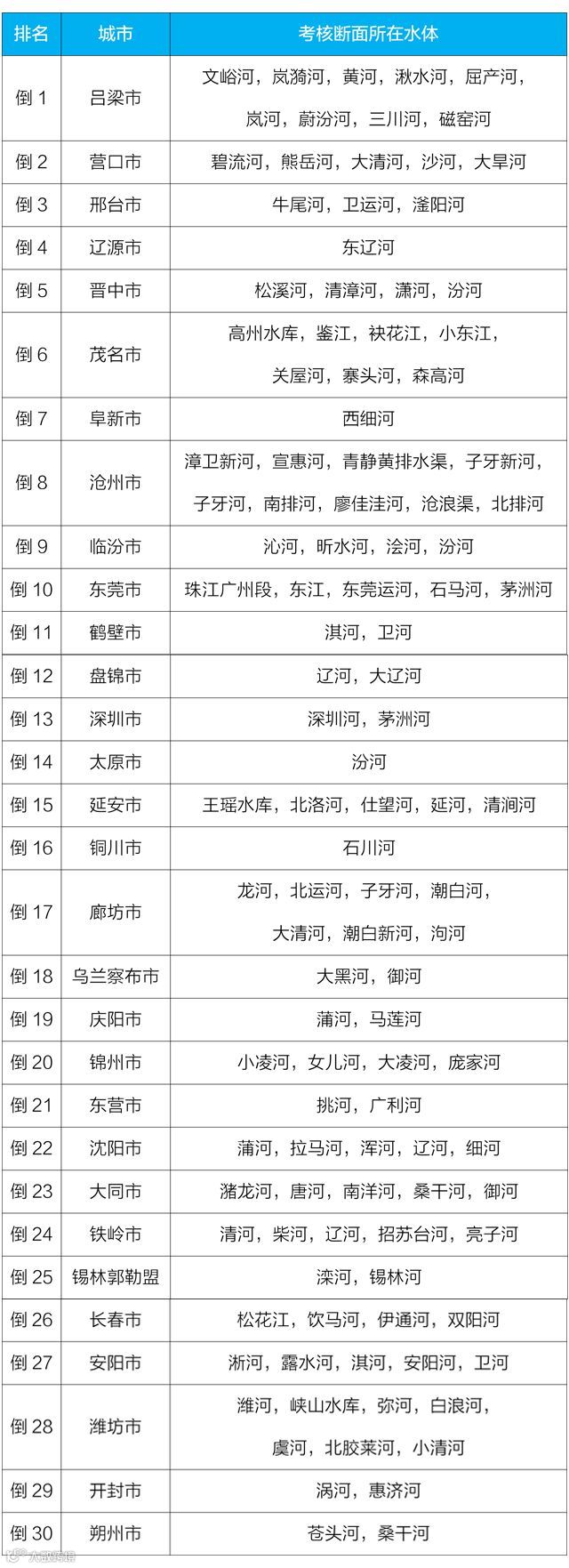 参加排名的全国地级及以上城市,覆盖2050个国家地表水考核断面(其中,1940个为国家地表水评价断面,110个为入海控制断面)。2019年1~3月,全国地级及以上城市中,雅安、来宾、云浮等30个城市国家地表水考核断面水环境质量相对较好(从第1名到第30名),吕梁、营口、邢台等30个城市国家地表水考核断面水环境质量相对较差(从倒数第1名到倒数第30名);四平、长春、中山等30个城市国家地表水考核断面水环境质量变化情况相对较好(从第1名到第30名),吕梁、营口、朔州等30个城市国家地表水考核断面水环境质量变化情况相对较差(从倒数第1名到倒数第30名)。详细见附表1~附表4。
