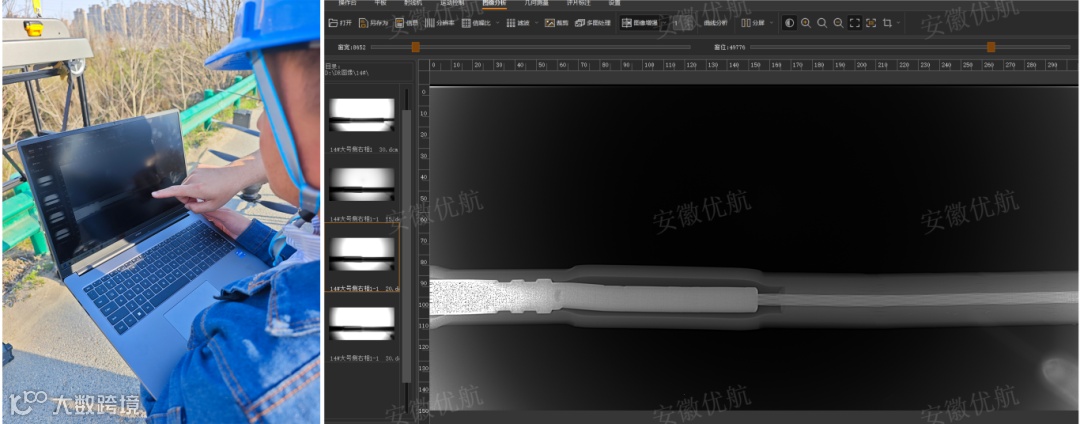 运用无人机搭载便携式高精度X射线检测装置,飞行到目标位置对输电线路电缆及连接部位进行探伤,检测人员启动X光射线脉冲机后,地面软件实时显示出成像结果。通过实时查看金具内部高清图像,精准判定金具压接质量是否合格、内部是否存在损伤,有效预防潜在的断线、掉线事故。