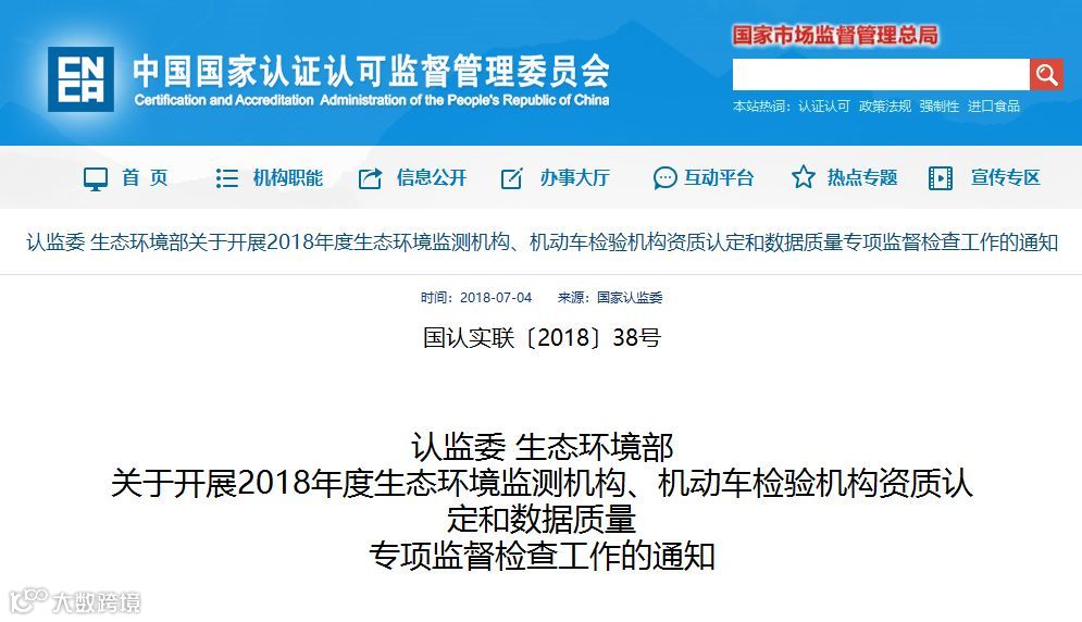 此前,生态环境部、国家市场监督管理总局已于5月31日联合印发《关于加强生态环境监测机构监督管理工作的通知》,并于7月4日印发《关于开展2018年度生态环境监测机构、机动车检验机构资质认定和数据质量专项监督检查工作的通知》。