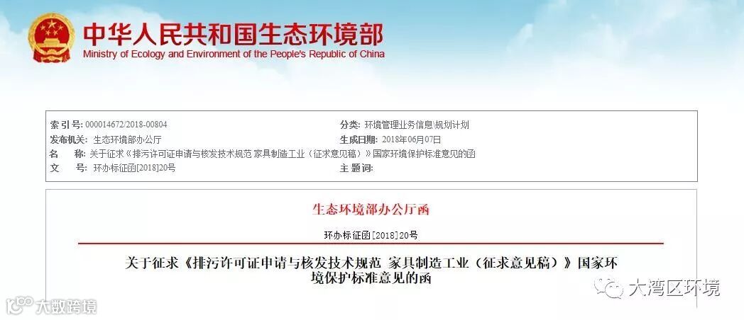 为落实国务院办公厅《控制污染物排放许可制实施方案》(国办发〔2016〕81号),加快建立和完善覆盖所有固定污染源的企事业单位控制污染物排放许可制,我部决定制定《排污许可证申请与核发技术规范 家具制造工业》国家环境保护标准。目前,标准编制单位已编制完成标准的征求意见稿。根据国家环境保护标准制修订工作管理规定,现就该标准征求你单位意见,请于2018年7月15日前通过信函或电子邮件的方式将书面意见反馈我部。逾期未反馈的,将按无意见处理。标准征求意见稿及其编制说明可登录我部网站(http://www.mep.gov.cn/)“意见征集”栏目检索查阅,同时也可登录国家排污许可申请系统 (http://121.40.139.218:8081/permitExtGT/outside/default.jsp)进行企业排污许可证申请试填报。