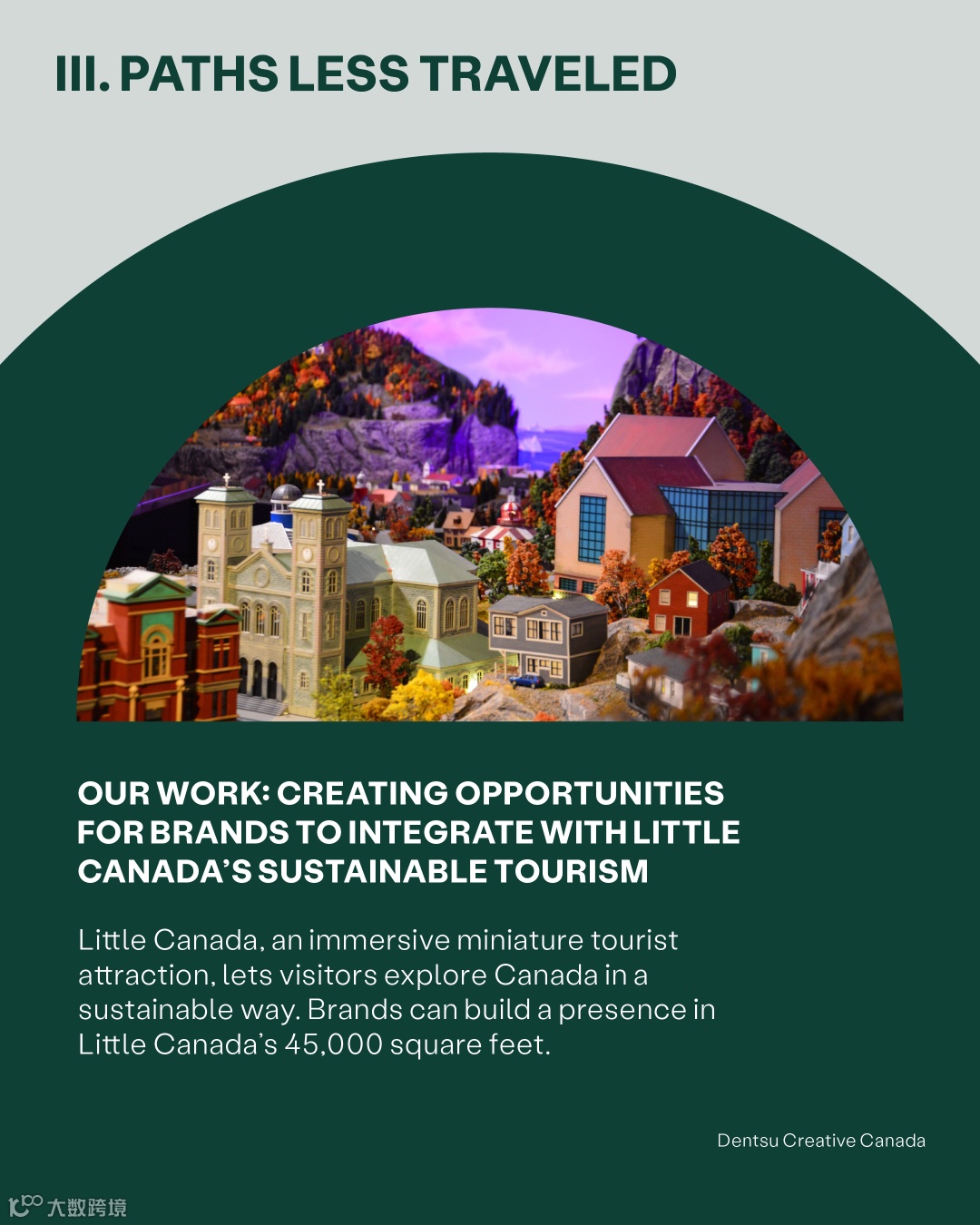 Little Canada(小加拿大)是一处沉浸式微型旅游景点,让游客以一种可持续的方式探索加拿大。在电通创意(Dentsu Creative)的帮助下,品牌可以在45,000平方英尺大的“小加拿大”里,通过迷你户外广告、迷你候车亭和迷你城镇等创新广告形式,建立自己的品牌形象。