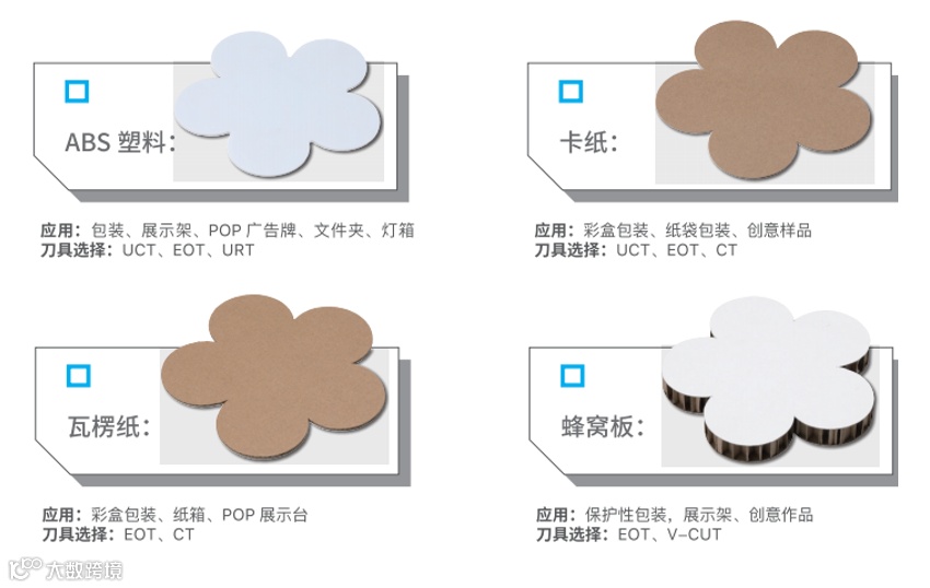 安美达裁切机能够处理多种材料,可完成广告行业所有相关材料(包括 KT板,纸板,PVC,亚克力,车贴等)切割需求,并且可高速、精准的完成全切,半切,镂铣,V型槽,折痕,标记等各项工艺。