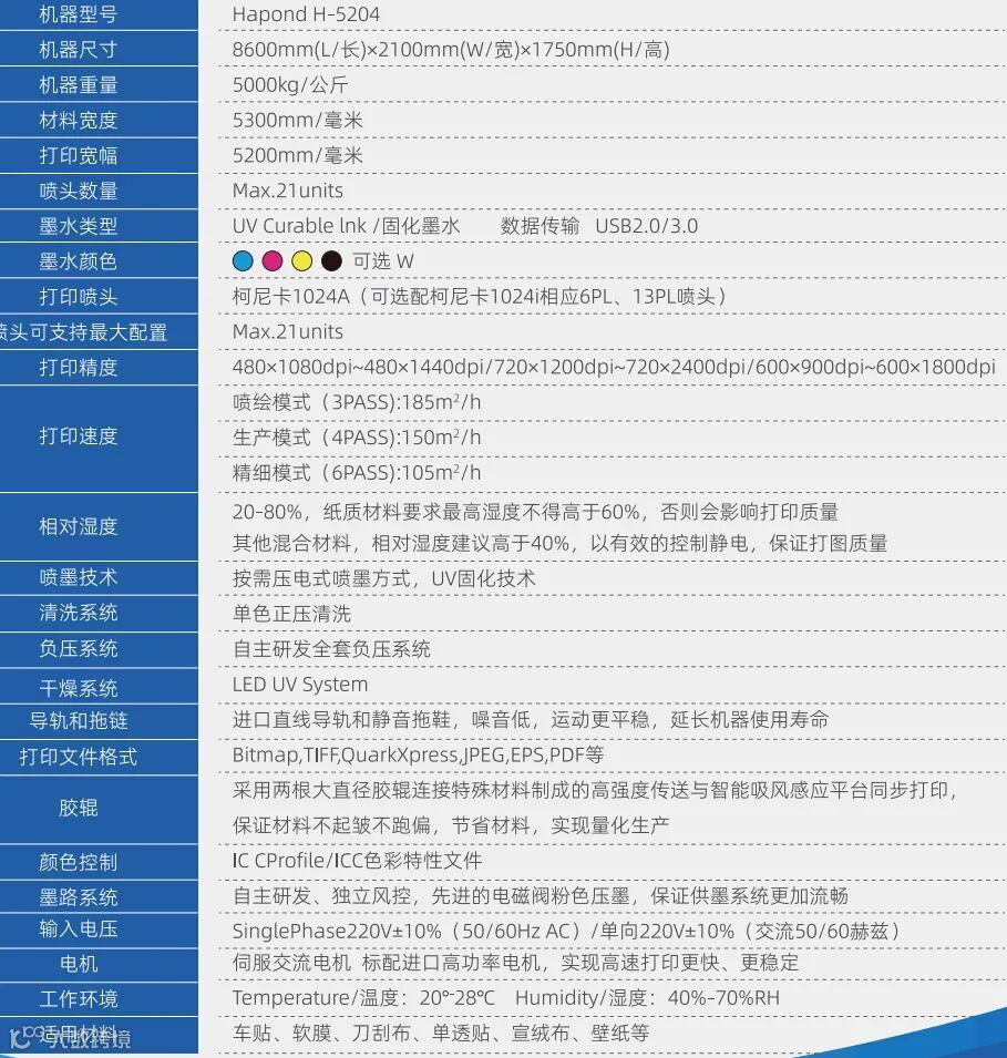 海邦达H-5204 卷板一体机色彩饱和,画面精度高,打印速度快,需求量大,搭配自主研发超高灵敏度负压系统、进口直线导轨和静音拖链,噪音低,运行更平稳,延长机器使用寿命。