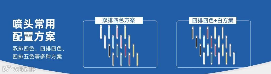 常用喷头配置有双排四色、四排四色、四排五色、四排四色+白等多种方案可选,生产速度可达185平米/小时,无论打印品质还是产能均领先市场同类产品。