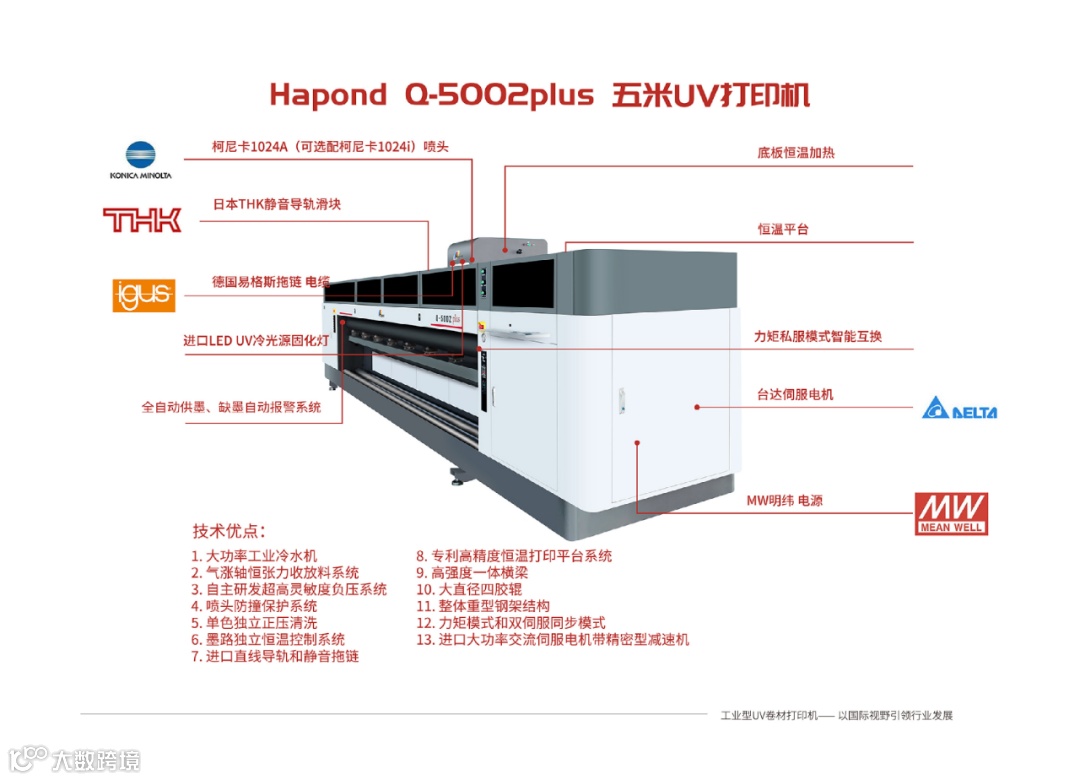 海邦达Q-5002 PLUS 五米UV卷材机,整体重型钢架结构,5米打印宽幅,进口大功率交流伺服电机带精密型减速机,开启超宽画幅不拼接打印时代,迅速为大型广告等领域发展提供了解决方案!