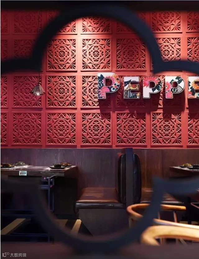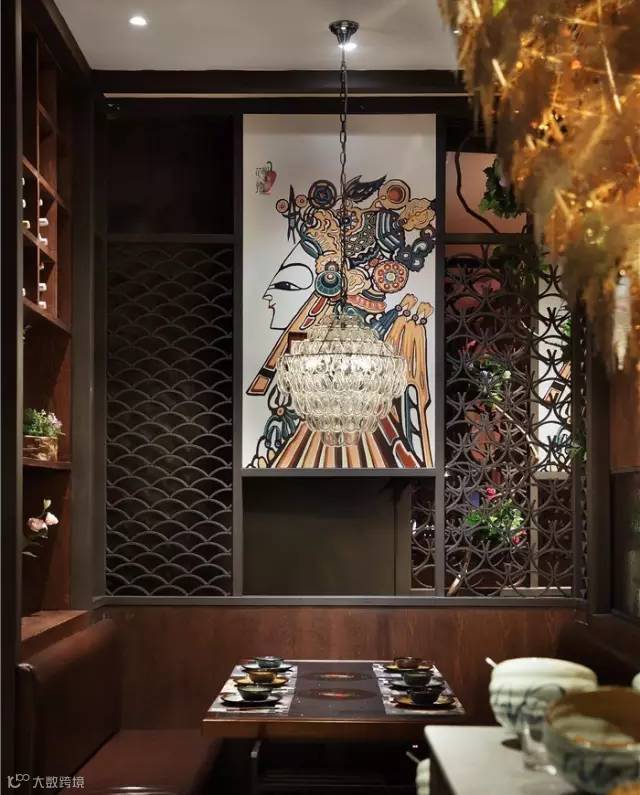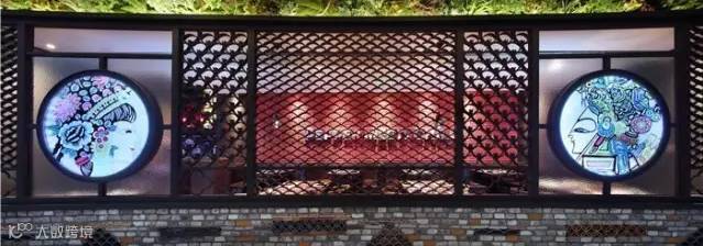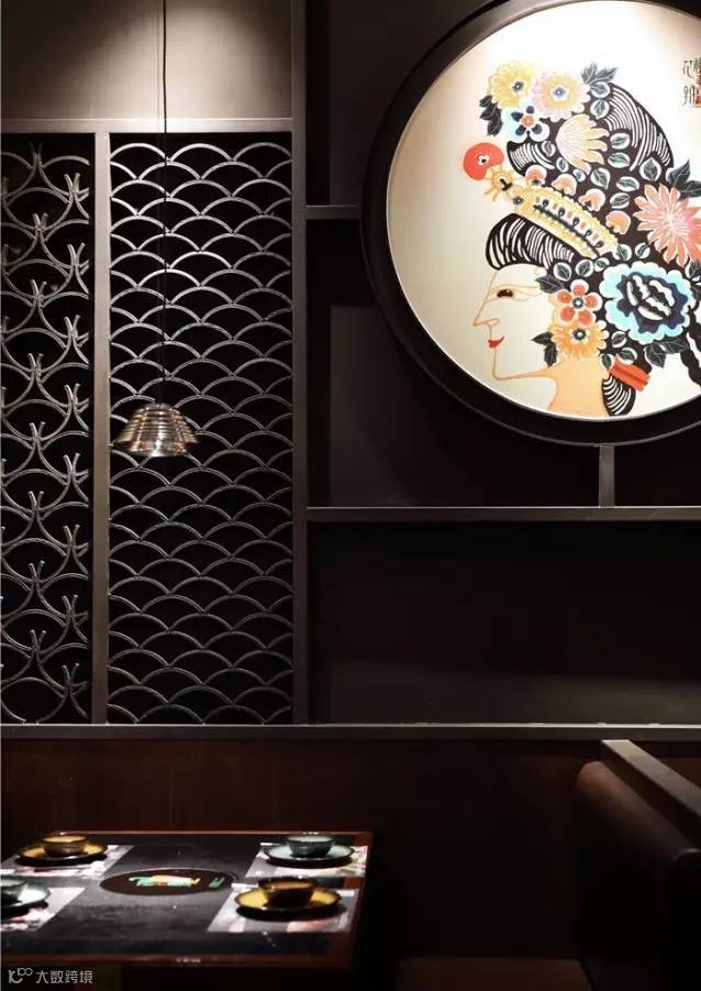 放眼整个空间,你可以看到皮影川戏图案、精巧灯笼、旧砖瓦墙等古典元素,设计师用现代的手法“借古遇今”,不仅诠释出古典的韵味,更融入现代风的轻巧简洁,营造出一个适合围炉畅聊的用餐氛围。
