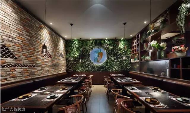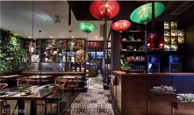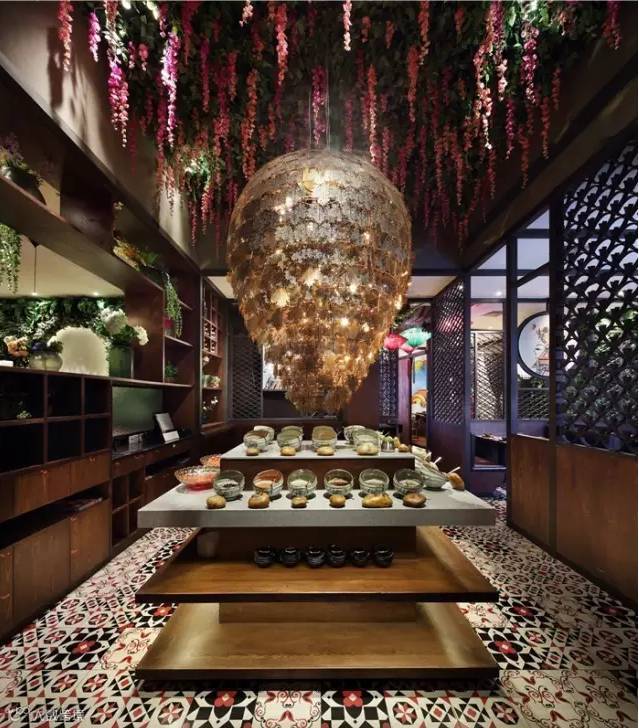 整个餐厅所选用的材质和颜色,与中式古典氛围比较相似,为了让怀旧复古中带有生机,于是设计师融合现代手绘图、创意绿植来提升现代感,辅以局部彩色灯光,更显小资温情。