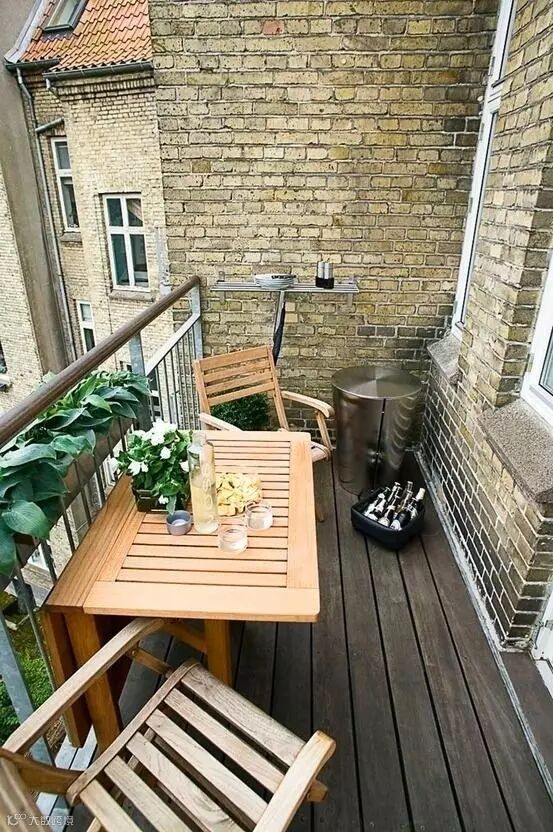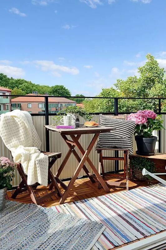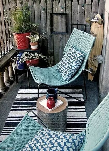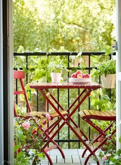 2、别具情调的小天地——只要简单的放入可以折叠的桌椅、绿植与小地毯。桌椅为木板且镂空,有助于散热。最后加个点缀抱枕与毛毯,即可给人一种慵懒午后的舒适感。