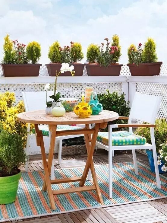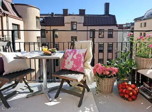 4、阳台的清新明朗,完全通过简约大气的白色围栏与户外家具打造,围栏不仅起安全防护作用还能作为盆栽的载体,各种植物的围绕,让你在小花园足不出户也能欣赏到大自然中最可爱的色彩。