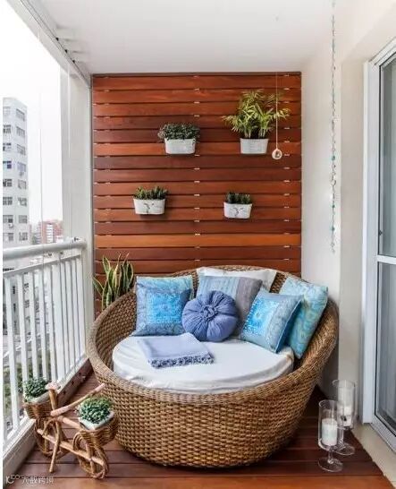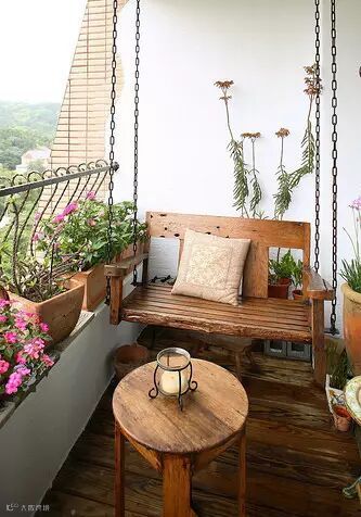 5、在阳台装上一吊椅或者是吊床,坐/躺在其中随风而摆,享受这惬意时光。室外花园式的原木地板,脚下每一次与地面的接触,都是一种享受,围上一圈鲜花,空气中弥漫着花香,这该是怎样一种享受。