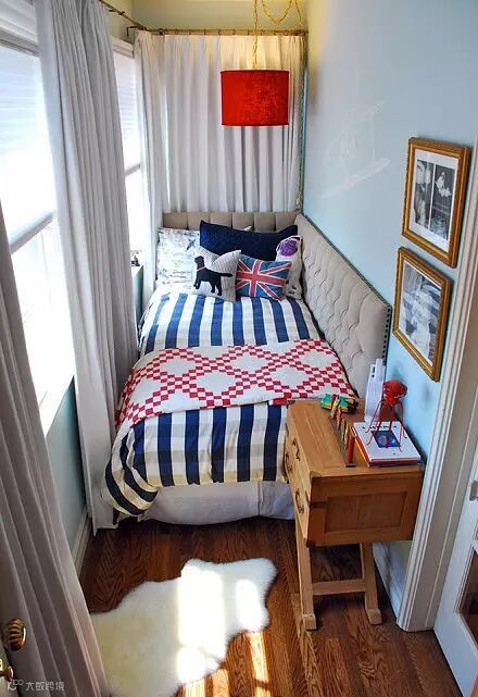 6、如果是狭长型的小阳台,可以定制一个L型的沙发,沙发下面留有收纳空间,既有了收放物品,又能在阳台上舒适得坐与躺,而墙壁的装饰物点缀,更使得阳台成为这个家最令人流连忘返之地。