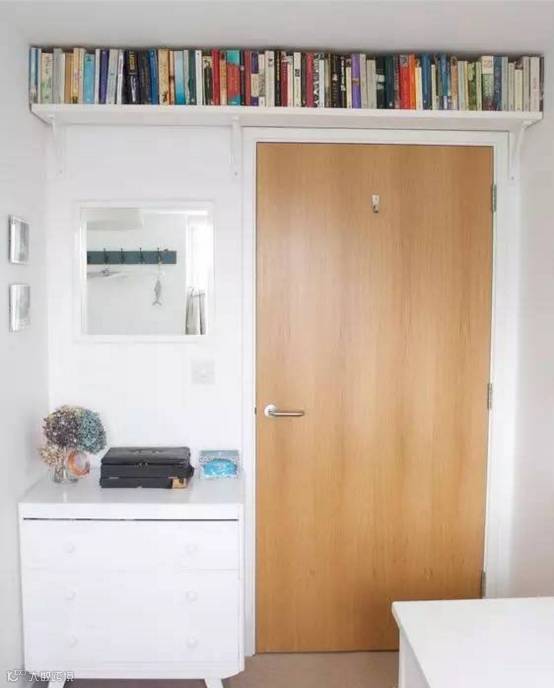 在门顶安上一大块木板,就可以打造悬空式的置物架,