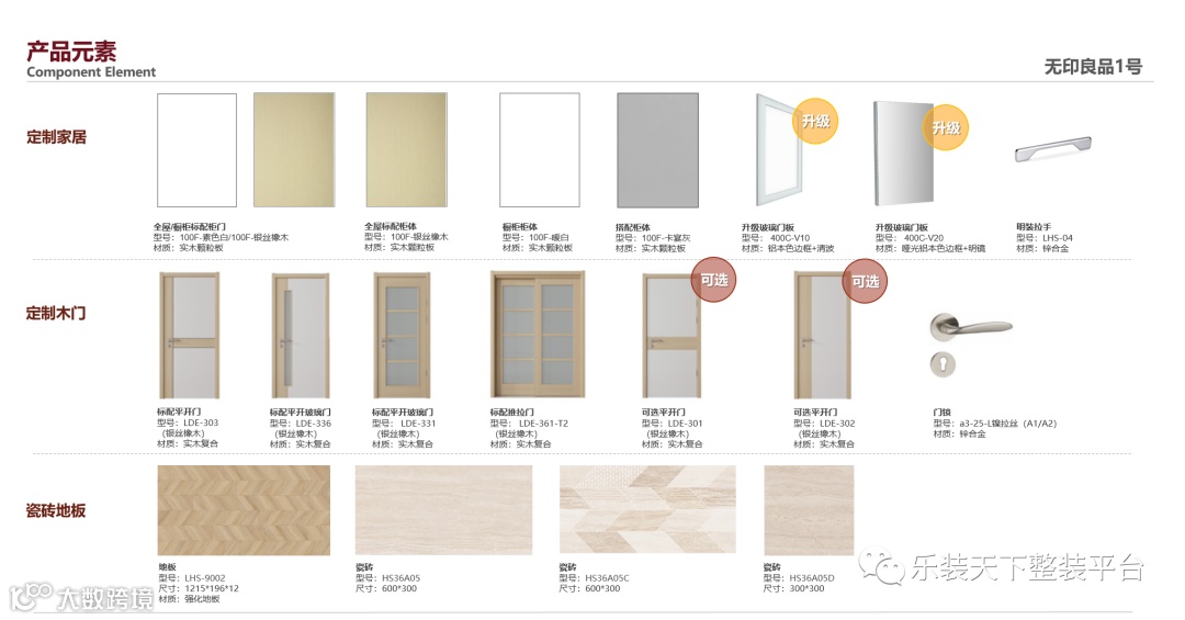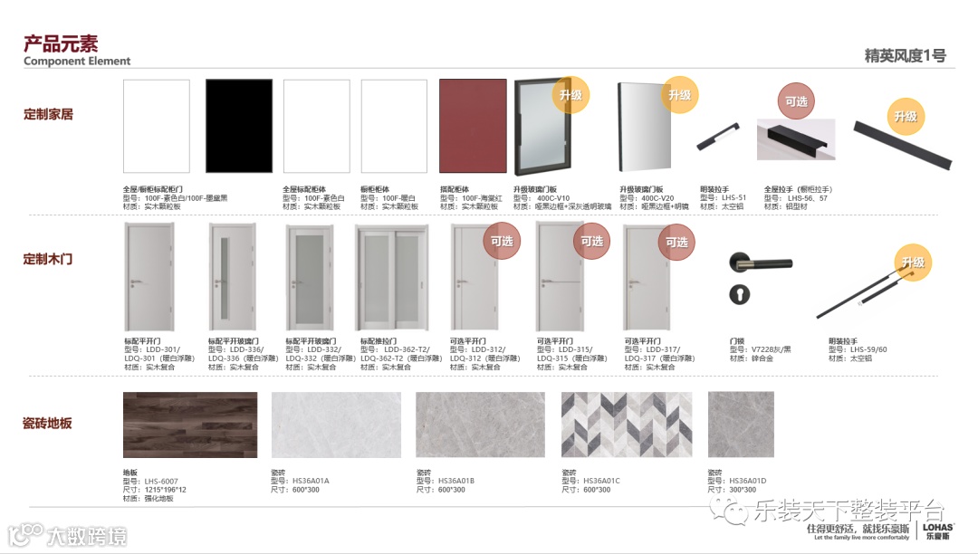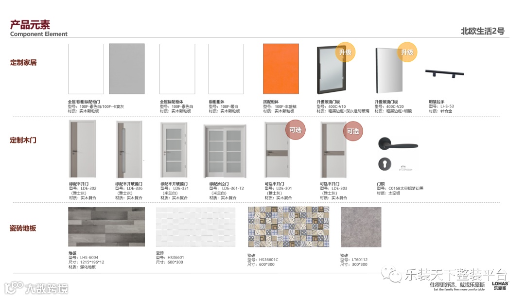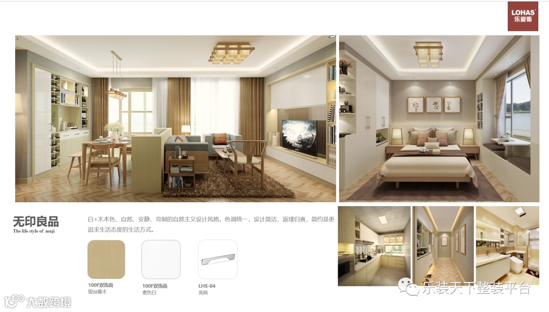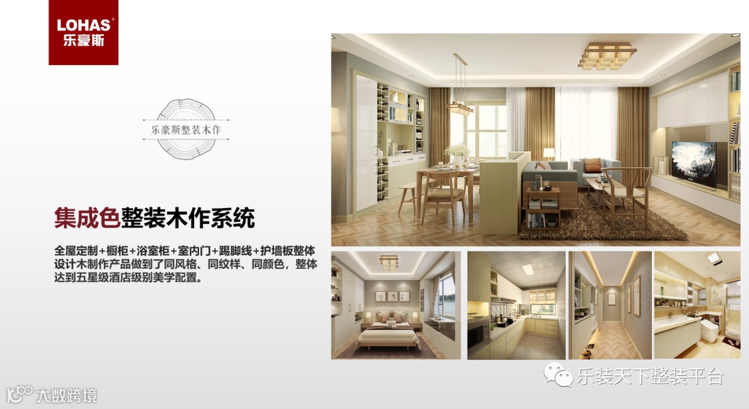 其次,一部好车需要各个零配件的完美匹配,整装产品也需要把不同品类之间的产品融合贯通起来,比如说颜值方面,如何让所有的木作产品包括木门、橱柜、全屋定制产品、浴室柜、踢脚线、护墙板等等,做到颜色统一、纹样统一、材质统一,我们乐豪斯叫做全屋木制作集成色。这个方面能做到的零售定制企业还不多,反而是地产精装里应用广泛。