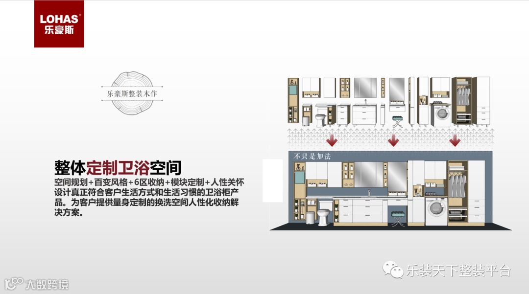 第四,整装卫浴空间解决方案,空间规划+百变风格+6区收纳+模块定制+人性关怀,设计真正符合客户生活方式和生活习惯的卫浴柜产品。为客户提供量身定制的换洗空间人性化收纳解决方案。