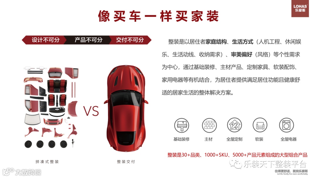 首先,先说一下我对整装的定义:整装是以居住者家庭结构、生活方式(人机工程、休闲娱乐、生活动线、收纳需求)、审美偏好(风格)等个性需求为中心,通过基础装修、主材产品、定制家具、软装配饰、家用电器等有机结合,为居住者提供满足居住功能且健康舒适的居家生活的整体解决方案。整装本质上是从客户出发的解决方案,产品只是实现解决方案的手段。你可以把整装产品理解成汽车,定制产品就是零配件。先根据客户画像研发汽车,再根据研发好的汽车设计匹配的定制产品。一款新车的研发先定好车型(风格)和价格,整装产品的研发也是先定好风格和价格,除了这两个重要的维度之外,还包括满足客户生活方式的功能属性。也就是汽车的配置。
