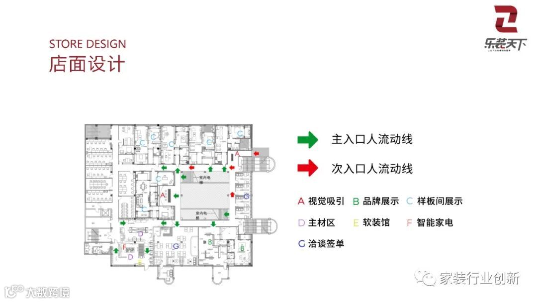包括视觉吸引、品牌展示、样板间展示、主材区、软装馆、智能家电、洽谈签单、办公区等,符合动线设计。