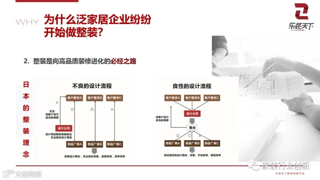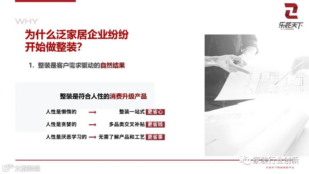 现在很多泛家居企业都开始做起了整装,不仅仅是一些半包公司,包括建材、全屋定制,甚至其他行业例如家电、地产也开始发展整装行业,个中原因一是整装是客户需求驱动的自然结果,也就是说,整装是符合人性的消费升级产品,一站式整装更加省心解决了人性懒惰的问题,多品类交叉补贴更省心满足人性贪婪的欲望,做整装无需了解产品和工艺让装修更加省事,也解决了大家没有