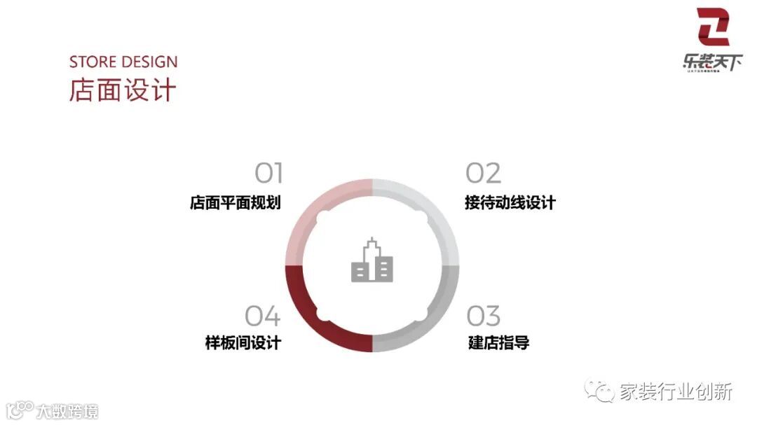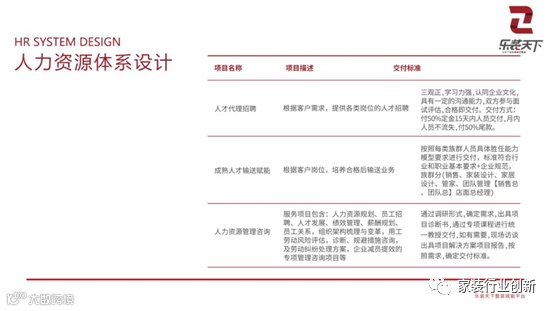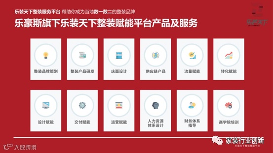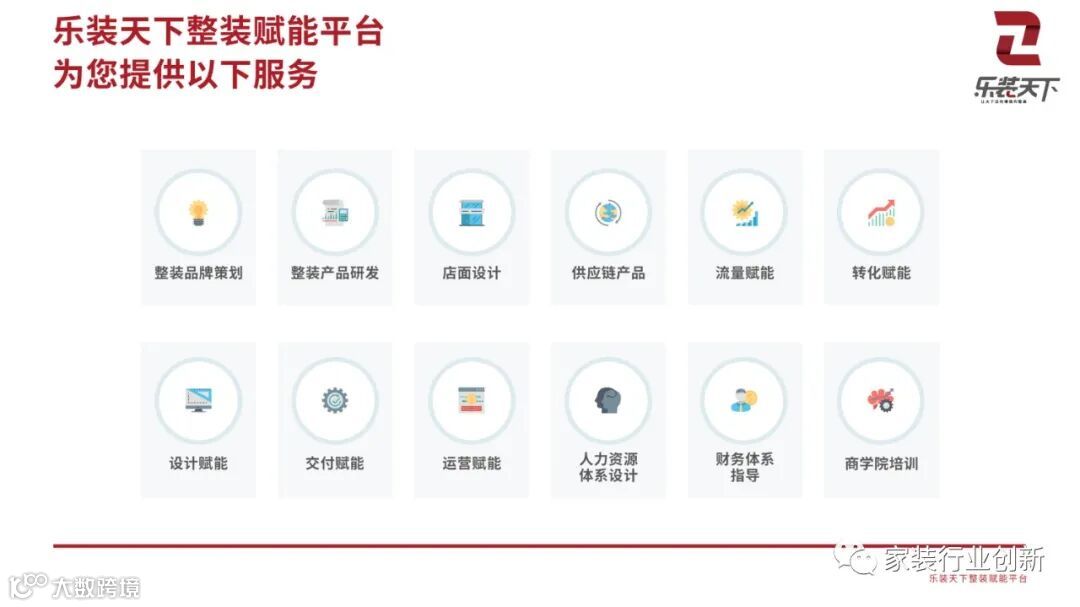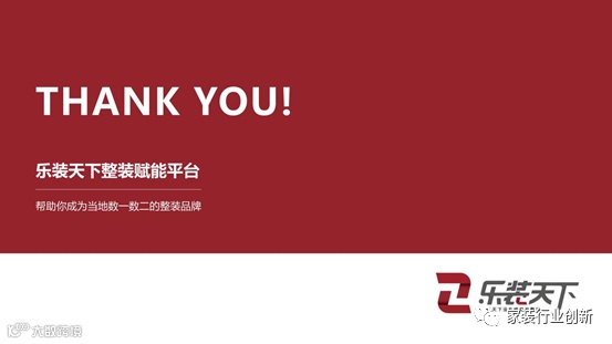 最后总结一下乐装天下整装赋能平台的服务内容:整装品牌策划、整装产品研发、店面设计、供应链产品、流量赋能、转化赋能、设计赋能、交付赋能、运营赋能、人力资源体系设计、财务体系指导、商学院培训。