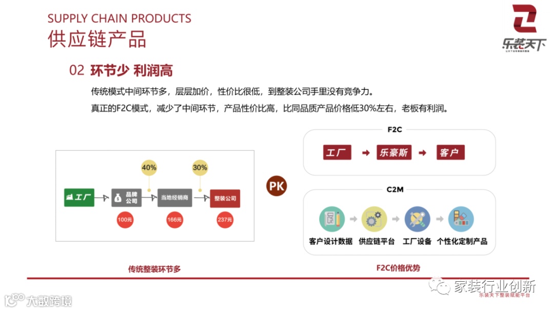 传统模式中间环节多,层层加价,性价比很低,到整装公司手里没有竞争力。