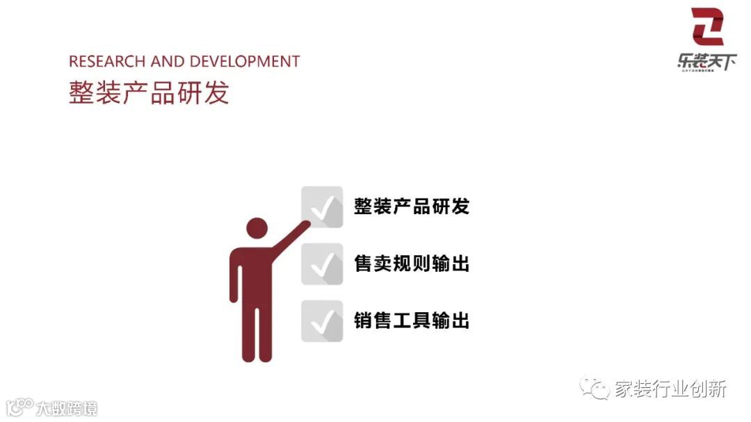 上述讲到是品牌策划方面,接下来是整装产品研发方面。乐豪斯经常说,像卖汽车一样卖整装,汽车需要研发,整装自然也是需要进行研发的,研发的目的是让企业快速冲销,客户快速接受,让产品更加标准化得进行售卖,还包括售卖规则以及售卖