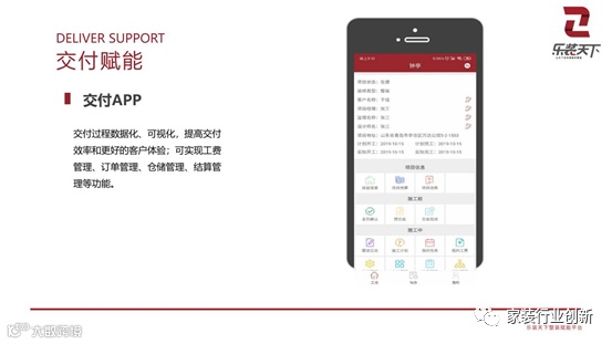 交付是整个整装体系内非常重要的一个环节,乐装天下为合作伙伴提供包括交付体系设计、交付APP以及整装交付指导在内的赋能服务。