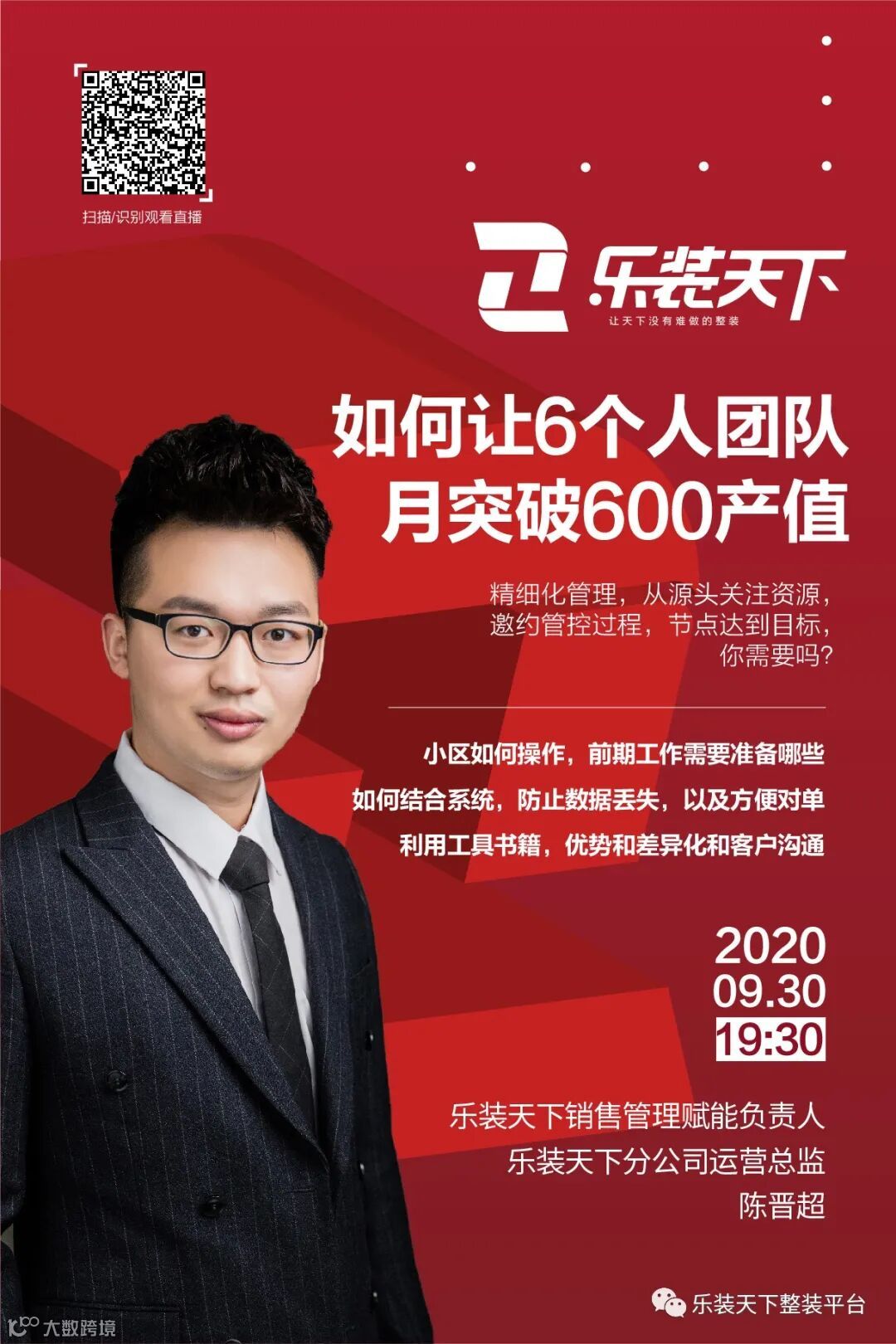 如何通过精细化管理让6人团队月产值突破600万,如何从源头管理资源,邀约管控过程,节点达到目标?明天9月30日晚上19:30,乐装天下人力销售管理赋能负责人&乐装天下分公司运营总监陈晋超先生将为大家传授如何让6人团队月突破600产值