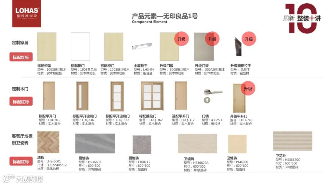 最后我们将所有的产品归纳成一张产品元素配置表,里面会展示包括定制家居样式,升级家居样式、定制木门款式、升级木门款式、以及地板瓷砖花片各个区域选取何种样式进行匹配。最终将这张配置表交由客户手中,无需客户自己挑选,设计师工作也非常简单,如果客户想要实现个性化选择,每种产品也能提供其他选择,可以对产品样式进行替换。
