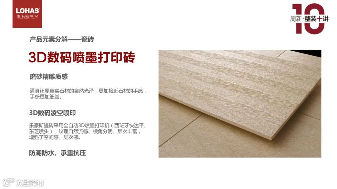 然后根据无印良品整个的风格,我们要对产品元素进行逐个的分解,首先是瓷砖,我们选择3D数码喷墨打印砖,逼近还原石材自然光泽和砂岩手感,这款瓷砖在市面上任何一家都找不到,因为这是乐豪斯专门为无印良品风格而打造的。