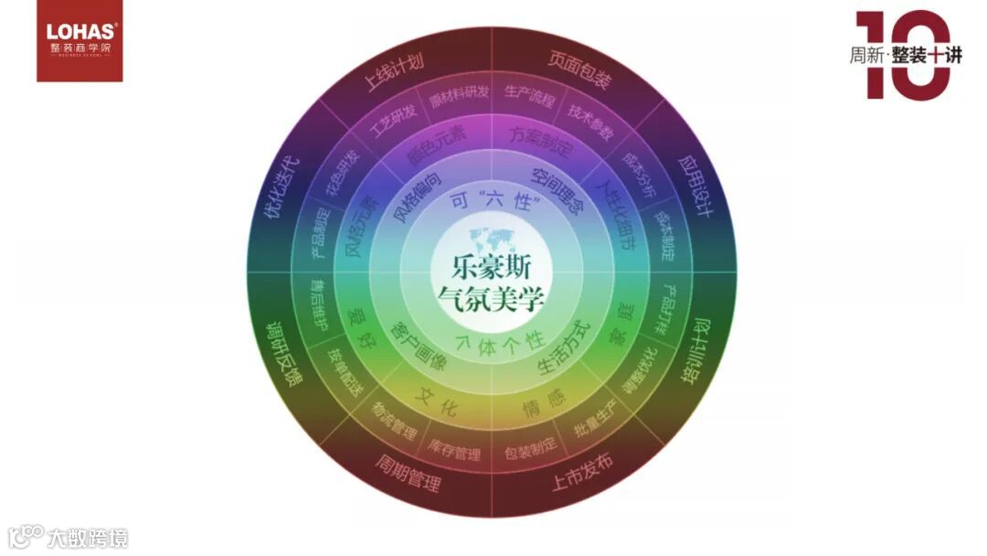 这里我提出一个词,也是我们乐豪斯一直强调的叫做“气氛美学”,基于气氛美学我们又提出了可“六”性和个体个性,再以客户画像、生活方式、风格偏向和空间理念为中心不断向外延伸,诞生出产品元素和后续的物流仓储、产品服务等项目。“气氛美学”是整个整装元素中的核心部分。