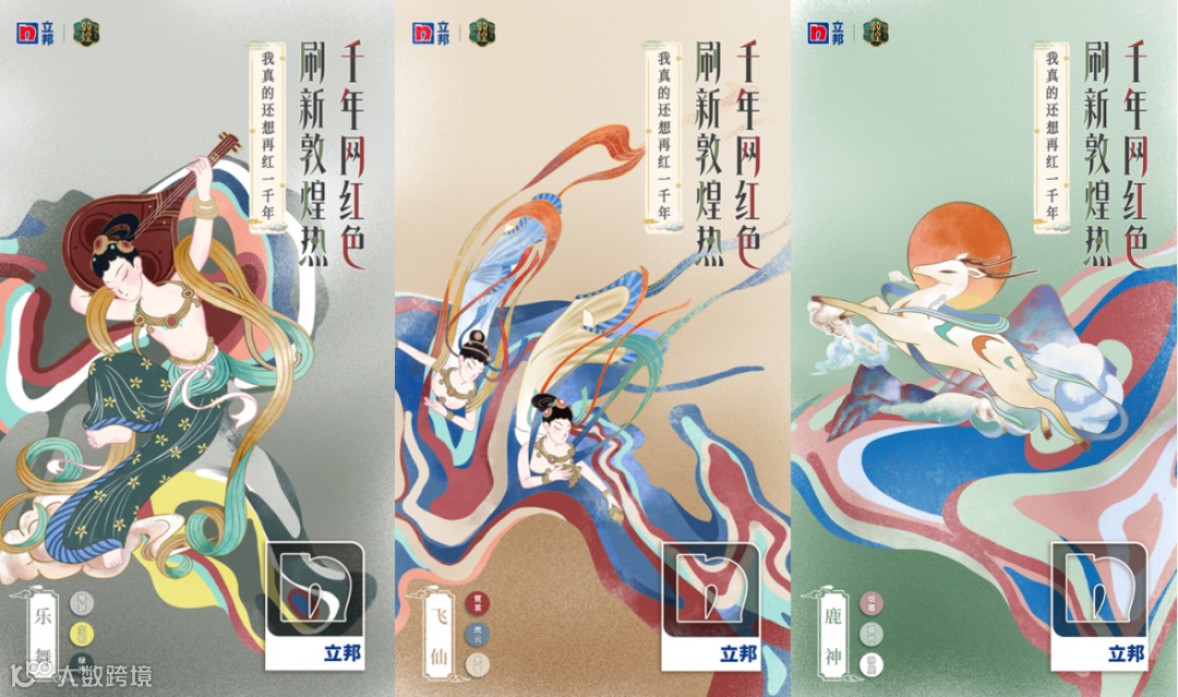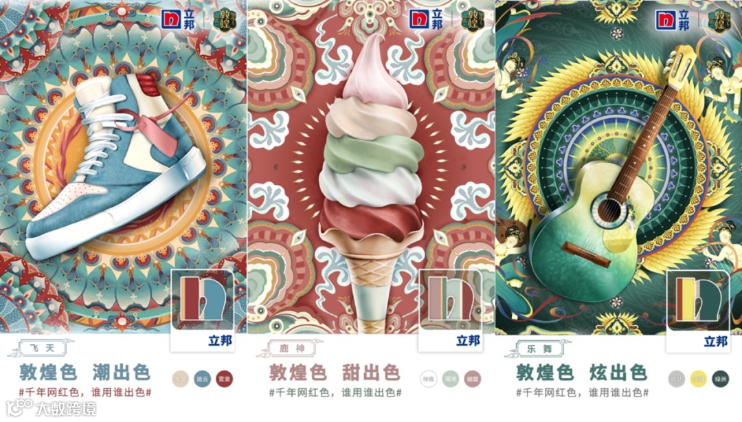 上海办公室洞察到在互联网环境中成长的Z世代,相较于70 80后民族自豪感更为坚实,更为热衷充满中国元素的“国潮风”。借由文娱综艺IP《登场了!敦煌》,从敦煌壁画的飞天、美食、潮流、边塞、运动等场景,采集“穿越千年的网红色”,为立邦打造“立邦国潮色 谁用谁出色”项目。