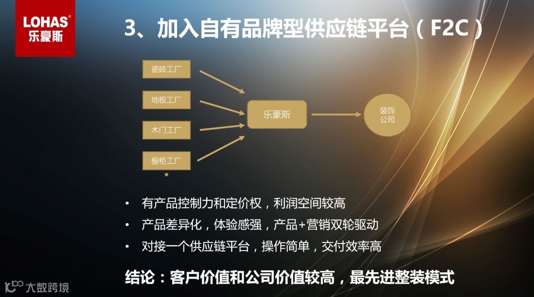 做整装最核心的就是选择供应链模式,供应链模式几乎决定了做整装的商业模式,乐豪斯是真正的F2C模式,减少了中间环节,产品性价比高。整装产品是经过研发组合好的,匹配度高,颜值高,客户价值较大。这个模式有产品控制力和定价权,利润空间高,模式可持续,公司价值高。