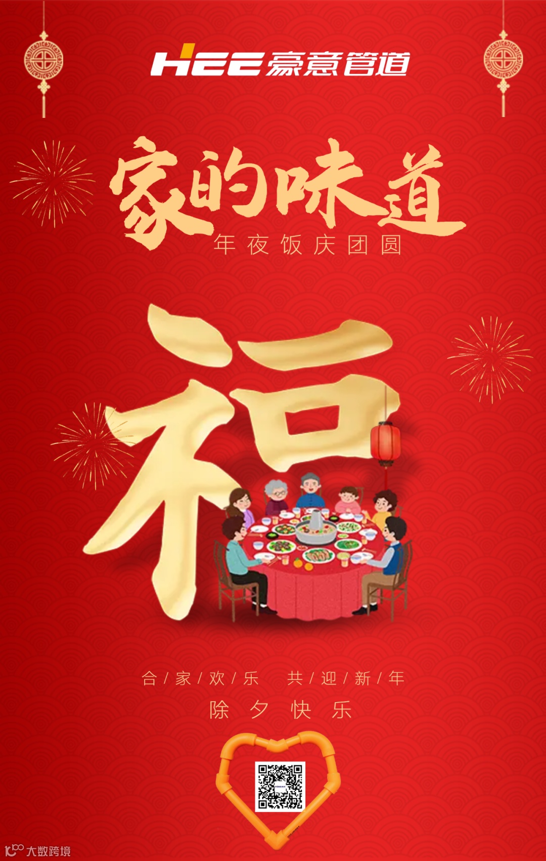 导读:在2021年农历牛年的最后一天,这个全家团聚共迎新年的美好时刻,豪意管业与您一起承喜纳福迎接崭新的2022年