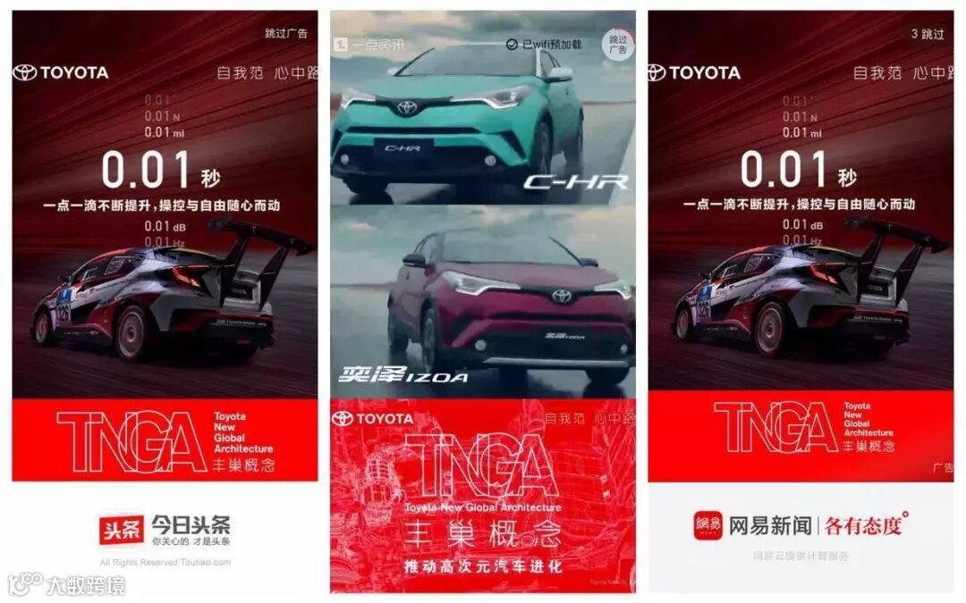 其次,在今日头条、1点资讯、网易新闻、酷狗音乐等资讯与娱乐类APP以及优酷等视频媒体上集中曝光。这些热门APP以及主流视频网站对于C-HR・奕泽IZOA的主要受众85、90后而言具有强大的传播影响力。并在汽车之家这样的传统汽车垂直网站上投放包含丰田汽车以及TNGA丰巢概念品牌信息的巨幅广告。