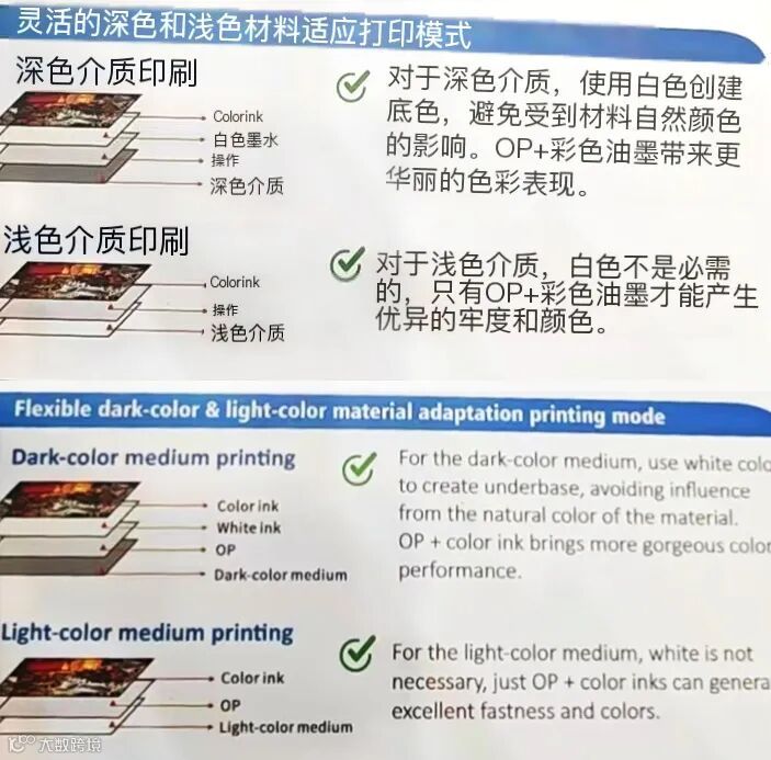 支持深浅色材料适配打印模式。针对深色介质,可通过白色油墨打底实现色彩还原;浅色介质无需额外处理,均可呈现精准丰富的色彩效果,OP+彩色油墨产生优异的牢度和颜色,能满足多样化打印需求。