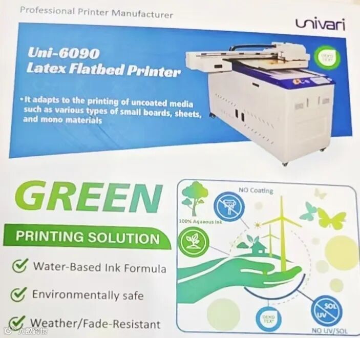 Uni-6090 乳胶平板机,60*90cm的打印宽幅,专为小板材、单色无涂层介质个性化打印设计,采用环保乳胶油墨配方,无刺激性气味,兼顾环境友好与安全。其打印成品附着力强,具备优异的耐褪色性能,无惧气候影响。