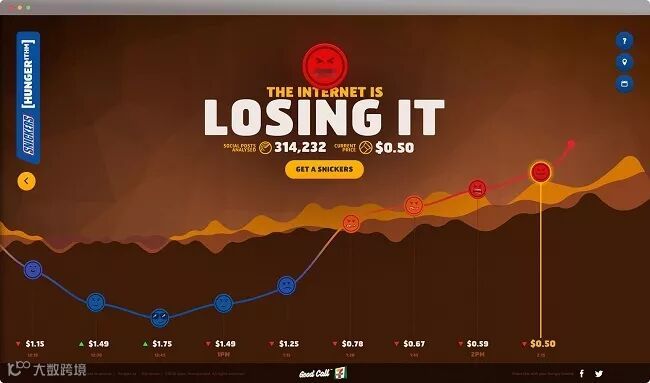 Chris Chen:国外已经有了数据可视化创意的奖项,我其实有在考虑要不要加到奖项里面来,在移动端这样的创意其实还蛮适合的。比如像去年 Spikes 的全场大奖就是一个澳洲的士力架案例,当你越生气,士力架的价格就越低。这其实呼应的是它一直以来的品牌理念:You’re Not You When You’re Hungry(你饿的时候,你不是你)。