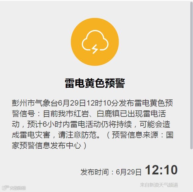 6月29日12时10分彭州市发布雷电黄色预警信号:目前我市红岩、白鹿镇已经出现雷电活动,预计未来6小时内雷电活动仍将持续,可能造成雷电灾害。四川森海润环境管理有限公司根据公司相关作业规定,启动雷暴雨天气应急预案。
