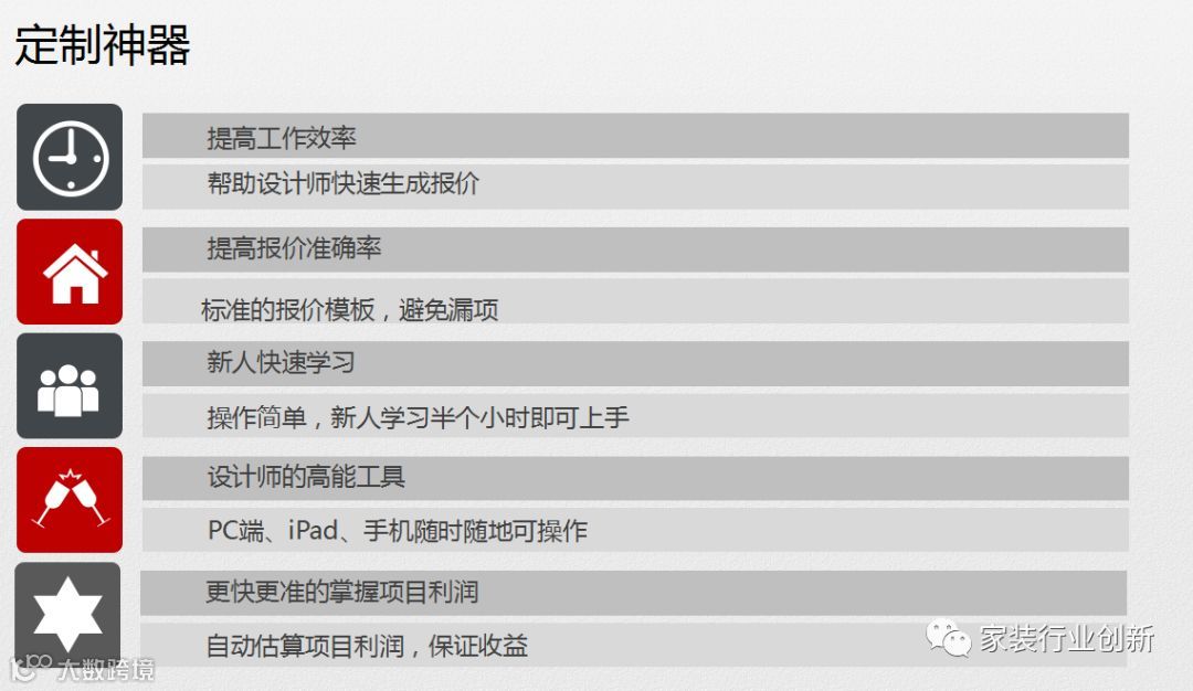 根据乐豪斯像卖汽车一样卖装修的理念,结合乐豪斯的销售方法,独立研发的一款报价系统完全乐豪斯定制款,新手培训1小时即可上手,不会错漏,定制神器又不仅仅只是一款报价系统,更有销售流程、产品介绍、产品手册、设计师常用资料,全国签单排名、数据统计等功能,让系统完全服务于乐豪斯人。