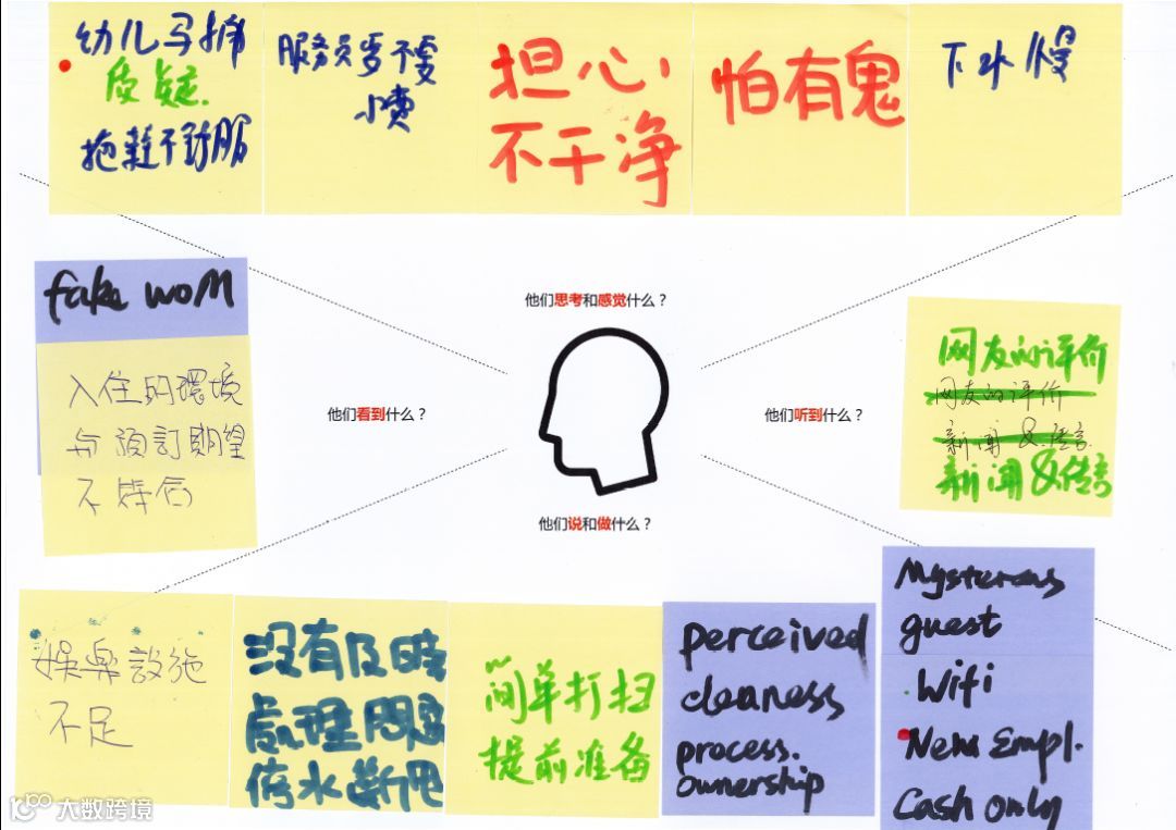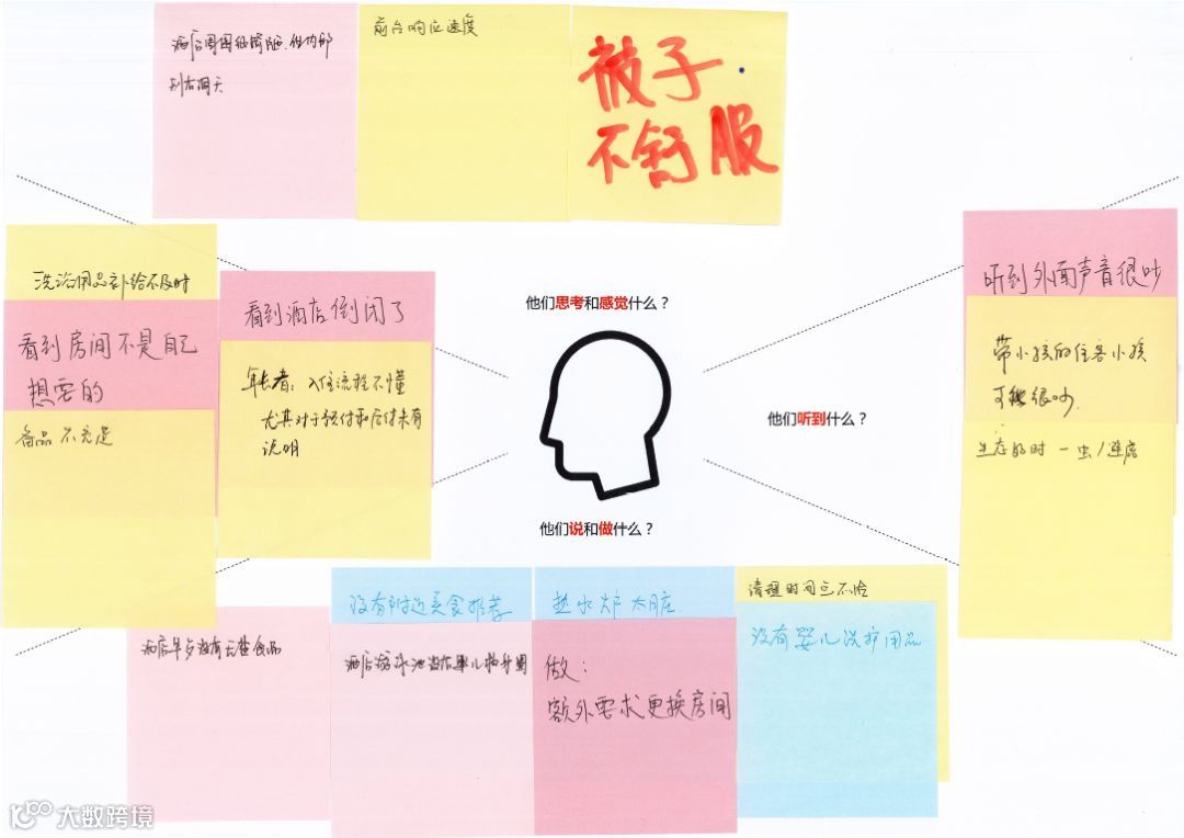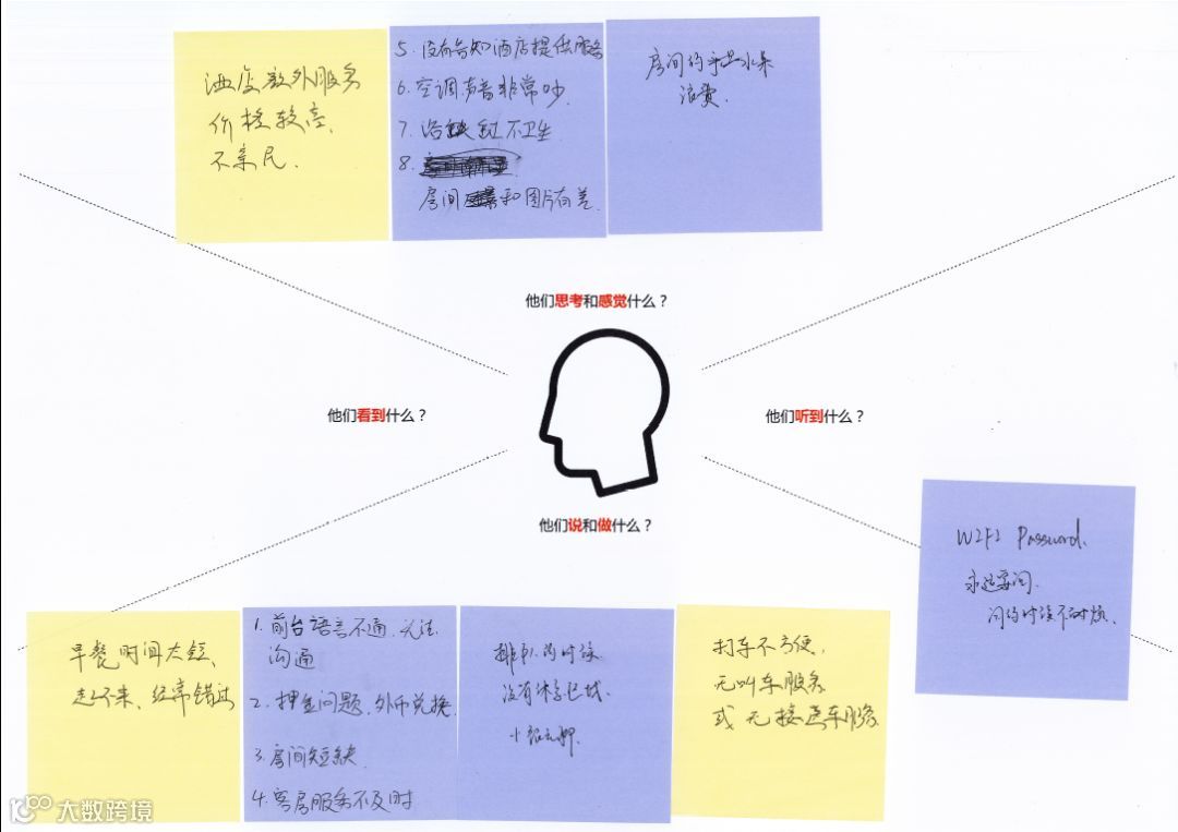 步骤一 – 感同身受:从用户角度观察酒店入住期间,并利用同理心地图工具,整理顾客看到什么与听到什么,以及他们的思考和行为。