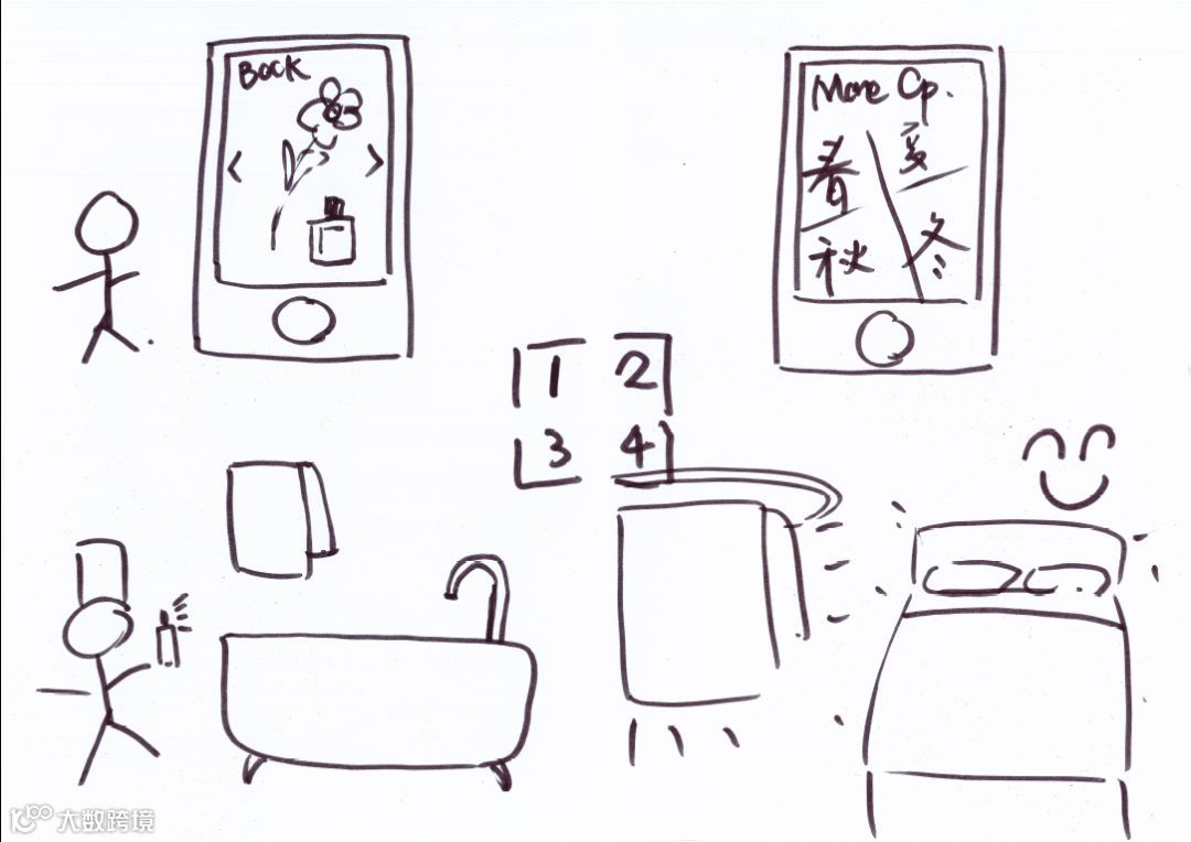 Δ解决方案二:顾客在入住前,可以通过酒店手机客户端选择精油香氛偏好,如:玫瑰、薰衣草精油香氛。酒店也可以按照季节设计一套季节专属的香氛。在清洁员打扫房间完毕之后,清洁员会喷上顾客所选的香氛。这样顾客在入住的时候就能够闻到他/她所喜爱的气味。代表床上用品已经被替换-没有遗留其他精油香氛的味道,且它们已经被彻底洗净-因此能够感受到微香。