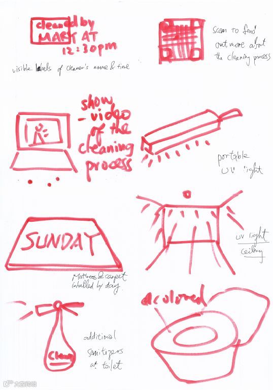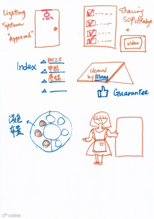那么,作为酒店,怎么提升顾客对客房整洁的信心,让顾客安心入睡呢?这里和大家分享两个工作坊当天大家利用设计思维产出的两个解决方案: