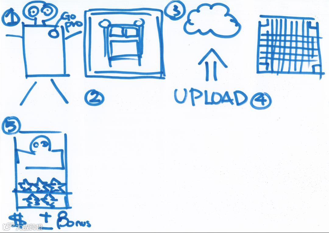 步骤四 – 制作原型:各组选取发想阶段的一个想法或融合发想阶段的多个想法,利用故事板展示这个解决方案。绘制故事板通常是制作原型阶段的首要工作。故事板能够有效地展现一个解决方案中多个重点时刻展现出来,帮助团队再聚焦产品或服务的方方面面,并能够帮助团队从目标用户得到初步的反馈。