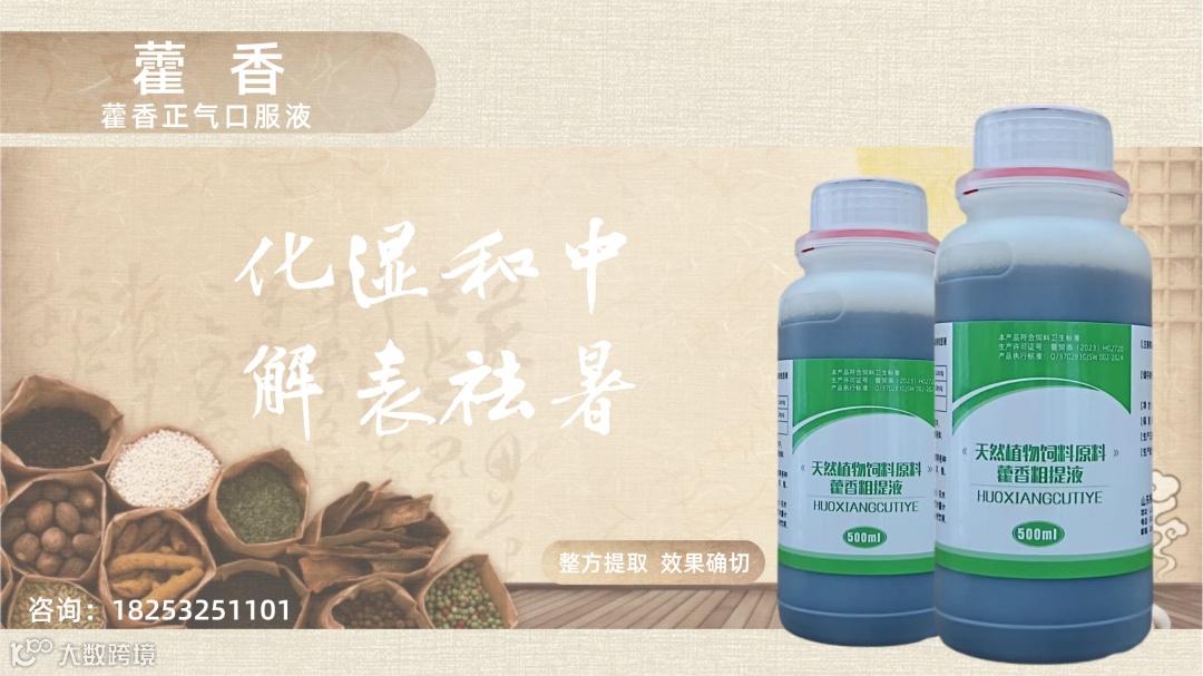 2:因“夏伤暑湿、外感风邪”引发恶寒发热、腹泻拉稀,采食低下等中暑、热感冒症状,出现伤亡时;使用本品藿香治疗,每瓶兑水1000斤,全体量集中使用4小时,每瓶加3斤葡萄糖效果更佳,连续使用2-3天。