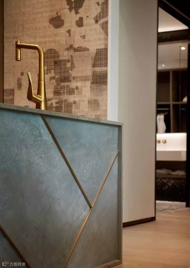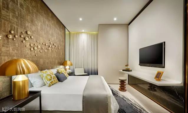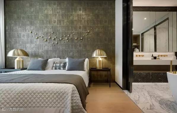 主人房带有强烈的金属时尚元素,金色纹理墙纸的主题墙上饰有金属球型立体墙雕,搭配大床两旁的金属床头灯及同色系床品,时尚夺目。趟门后的浴室同样是把浴缸置于浴室中央,两旁为洗手台和衣柜,展现户主尊贵的生活气派。
