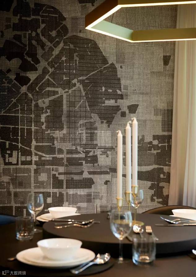 餐厅以一幅图案别致的落地格纹墙纸作主题墙,墙前摆放一张黑色圆形木餐桌,搭配四把黑色真皮扶手餐椅,加上一盏六角环形金属吊灯,让整个空间绽放时尚气息。户主及宾客还可以走到餐厅旁的露台上,远眺吉隆坡地标双子塔和市内的优美景色。