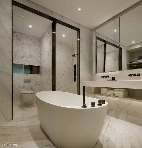 拉开浴室趟门,即见浴缸置于浴室正中央,两旁为洗手台及衣柜,既凸显户主的非凡品位,亦可让户主享受私密的沐浴时光。